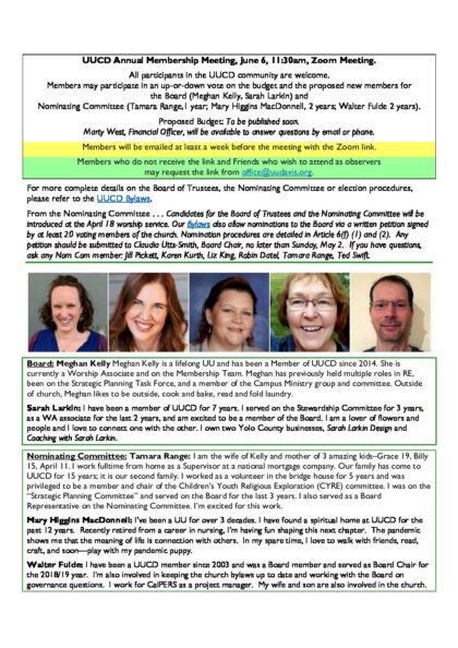 UUCD Covenant: Creating and living within a spiritual community with actions based on respectful conversation, receptive listening, openhearted presence.